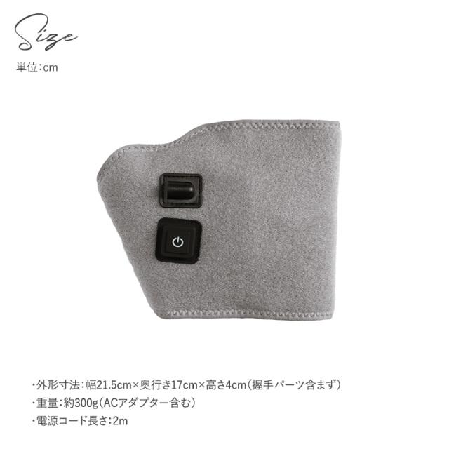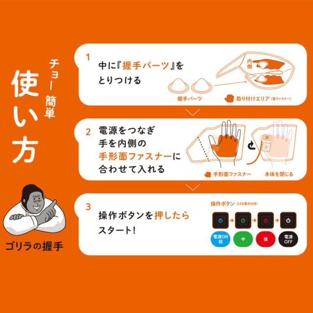内側の面ファスナーに「握手パーツ」をセットして、手を入れるだけの簡単装着。ボタンひとつで電源オン・オフと強さ調整の操作が可能です。