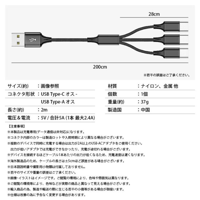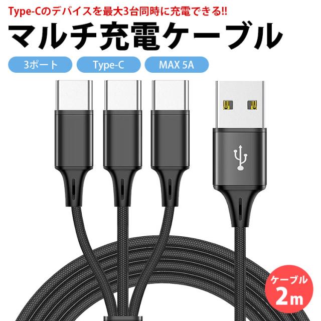 USB Type-C マルチ 充電ケーブル 2m 200cm 3股 合計5A 最大2.4A 同時充電 USB C タイプC ナイロン 編込みケーブル スマートフォン タブレット スマホ PR-UTC09-200【メール便 送料無料】