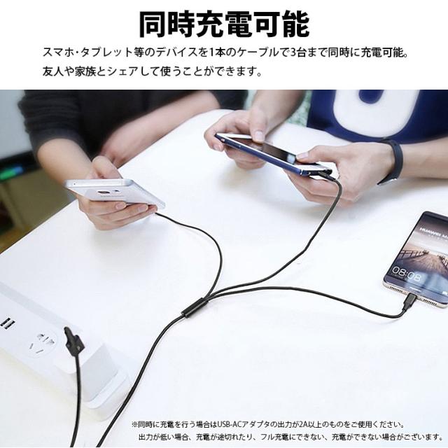 スマホ・タブレット等のデバイスを1本のケーブルで3台まで同時に充電可能。