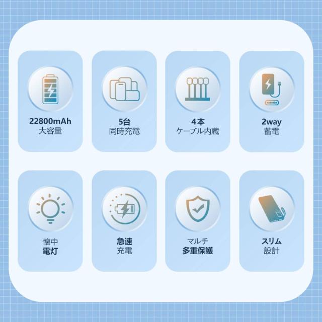 【バージョンアップ新商品GET!】モバイルバッテリー 軽量 22800mAh 大容量 小型 スマホ充電器 薄型 5台同時充電 急速充電 5v/2.4a 残量表示 4本ケーブル内蔵 防災電源 iPhone/iPad/Android対応