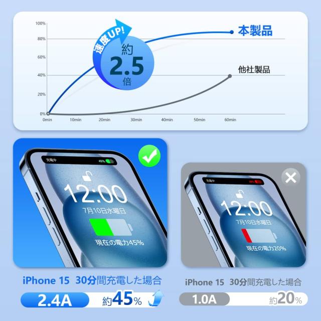 ・今まではモバイルバッテリーの充電が完了後にスマホに給電するタイプでしたが*パススルー機能搭載により、モバイルバッテリーに充電しながらスマホに給電することができます。(充電と給電を同時にできる機能)