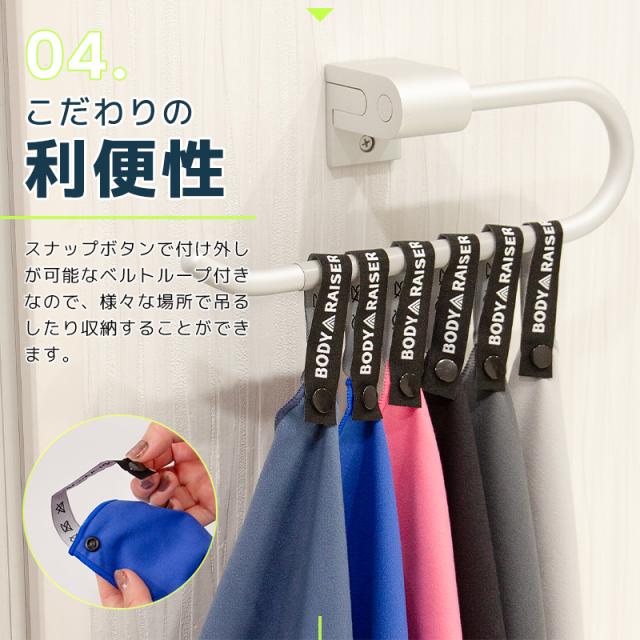 BODYRASER マイクロファイバー速乾タオルは、驚きの吸水力と速乾性が魅力です。一般の綿タオルの約3倍の吸水力で、濡れた体をサッと拭き取れます。さらに、速乾性が高いので、すぐに乾いて次の使用に備えられます。繰り返し使える高耐久性も嬉しいポイント。スナップボタンで付け外し可能なベルトループ付きで、持ち運びもラクラク。ゴルフやプール、アウトドア、キャンプ、旅行、サウナなど、様々なシーンで大活躍します!