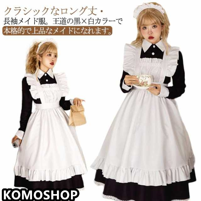 メイド服 エプロン 送料無料 長袖 クラシック カチューシャ付き ワンピース ロング 仮装 女装 ゴスロリ カフェ ハロウィン 大きいサイズ パーティー イベント カチューシャ付き コスチューム ハロウィン 3点セット