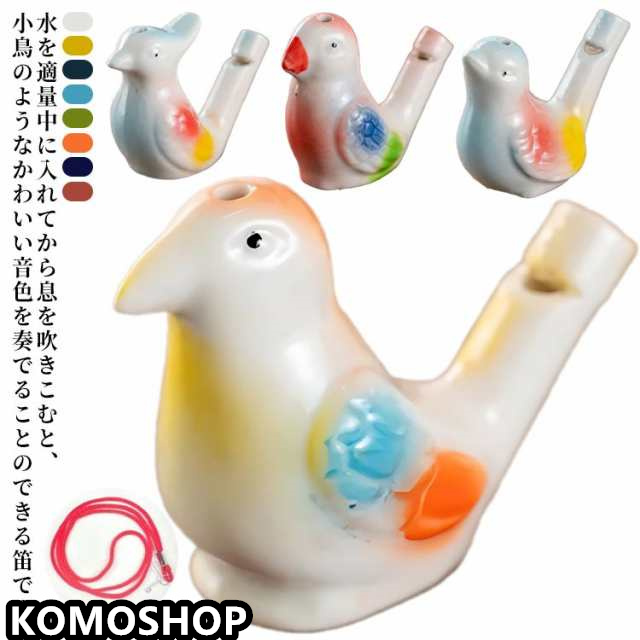 | 水を適量中に入れてから息を吹きこむと、小鳥のようなかわいい音色を奏でることのできる笛です。 陶器で作られているので、ツヤツヤした質感がまた可愛らしいです。 手作りなのでひとつひとつ微妙に違うところも味ですね。温もりが感じられるものばかり。 水を入れて吹くだけで鳴らすことができるので、誰でも鳴らせて子どもたちも喜びそう。 暇つぶしや、癒やしのアイテムとしてオススメです。お子さんと一緒に遊びましょう! | |