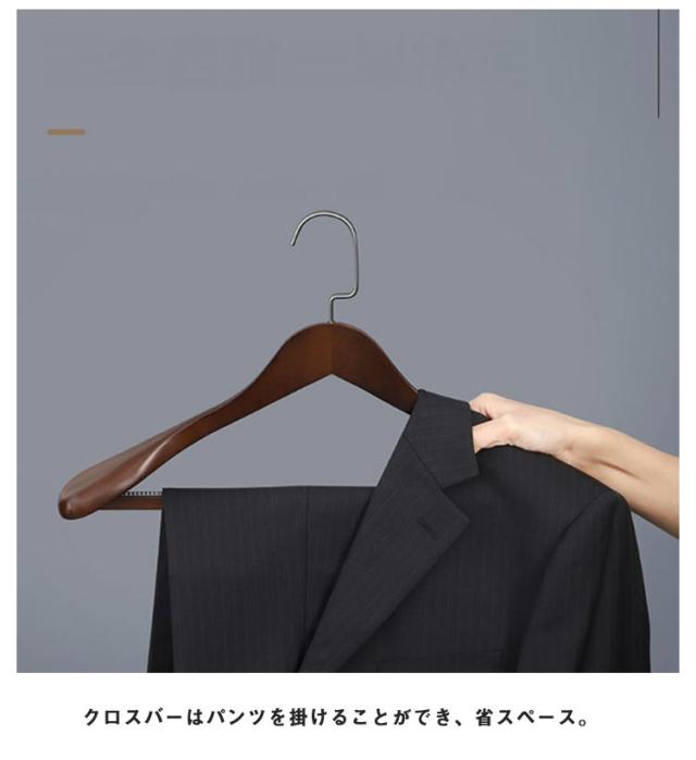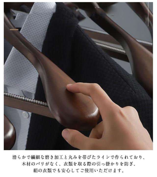 | 肩部分に厚みを持たせ、大切なスーツの型崩れを防ぐ機能を追求したハンガーセット 紳士風の濃くブラウンの色調と木の紋様は落ち着いた雰囲気と高級感を醸し出します。 人間工学に基づいたアークのデザイン衣類の形を保持して変わりません。 5.5cm広い肩と前傾させた美しいラインで服を効果的に滑り止めスーツをぶら下がることができます。 滑らかで繊細な磨き加工と丸みを帯びたラインで作られており、木材のバリがなく、衣類を取る際の引っ掛かりを防ぎ、絹の衣類でも安心してご使用いただけます。 クロスバーはパンツを掛けることができ、省スペース。 サイズもお手持ちの洋服に合わせて選べる2サイズをご用意しております。 | |