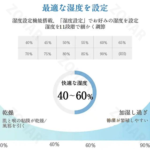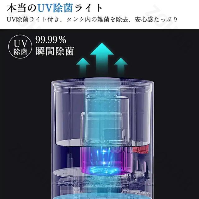 ・UVライトは抗菌機能があり、UVボタンを触れるとライトが点灯し、水中の細菌を99%取り除きます。この加湿器は清潔なミストを噴出することができます。また、水溶性のアロマオイルにも対応しており、お好みのアロマオイルをタンクに入れることで部屋全体に心地よい香りが広がります。(注意:次亜塩素酸水を使用したい場合は希釈してください。50ppm以下の濃度がおすすめです)
