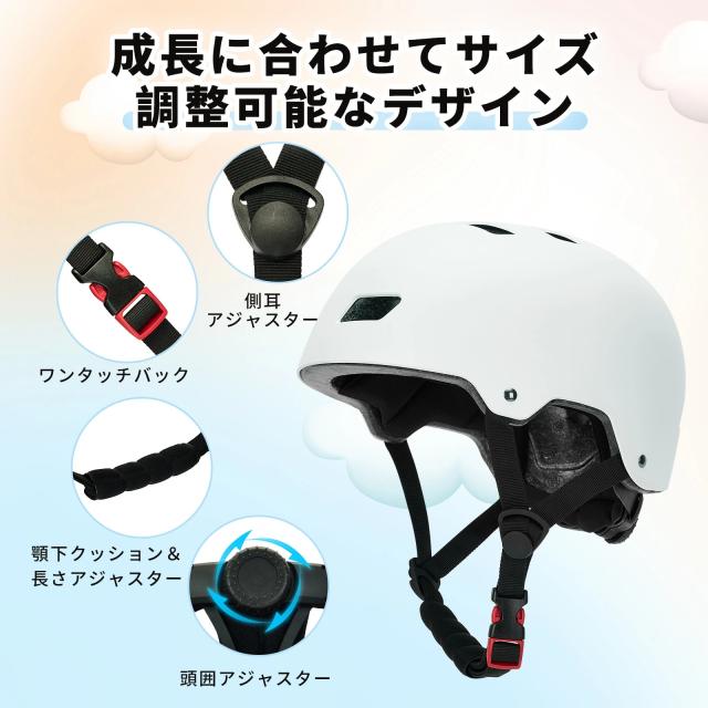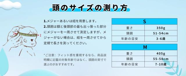 本製品は日本人の頭の形に合うよう作られています。Sサイズ(51~54cm)、Mサイズ(55~58cm)2つのサイズがあります。装着時のフィット感を高めるため、後のアジャスターでサイズを微調整できます。より快適に着用することができます。ご注意:頭のサイズは個人差がありますので、対象年齢範囲内でも必ずサイズをご確認の上ご注文ください。