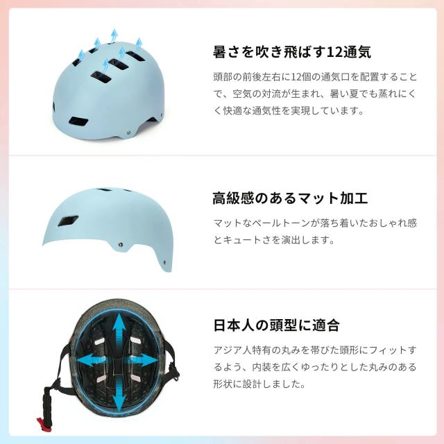 通気性を確保するため、このヘルメットには12つ通気口が設計され、内部の熱がこもりにくく、長時間着用しても不快に感じません。体温が高く、汗を多くかきやすい子供にとって快適にかぶれるヘルメットです。夏でも蒸れにくい、気楽に友達と遊ぶことができます。
