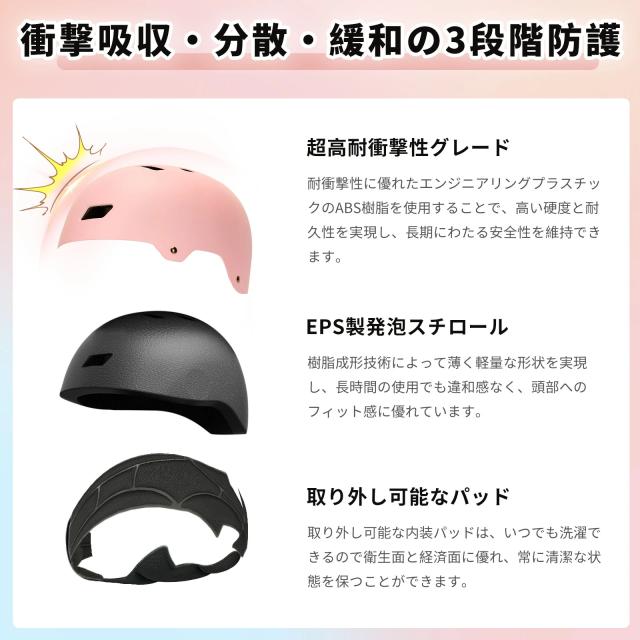 【高い衝撃吸収性・超軽量】外殻は耐衝撃の高密度ABSで作られ、外部からの衝撃を効果的に吸収し、着用者の頭部を保護することができます。内層ライナーには軽量で断熱性、防水制に優れたEPSを使用、重量350〜405g、首への負担を減軽し、低年齢のこどもでもかぶりやすいです。また、内層ライナーが取り出して洗濯可能、長く使うことができます。