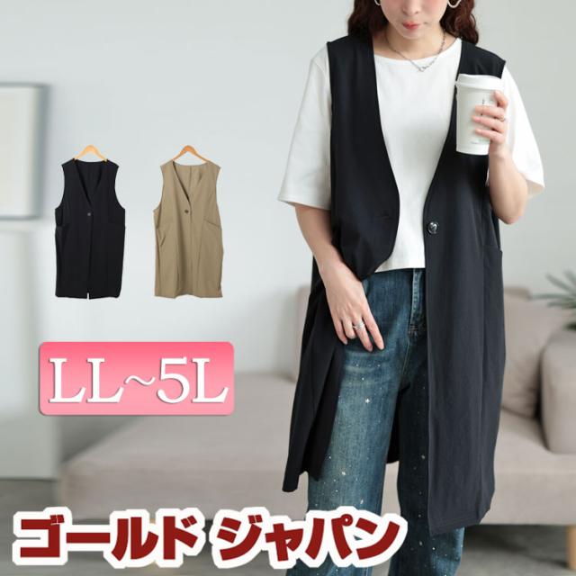 春新作 大きいサイズ レディース アウター ベスト ジレ コート ジャケット バックスリットノーカラーロングジレ ロングベスト ロングジレ ノーカラー ロング スリット ポケット ボタン ストレッチ ゆったり 春服 秋服 LL 2L 3L 4L 5L ブラック 黒 ベージュ ゴールドジャパン