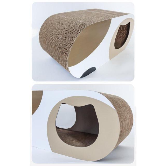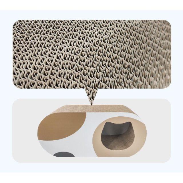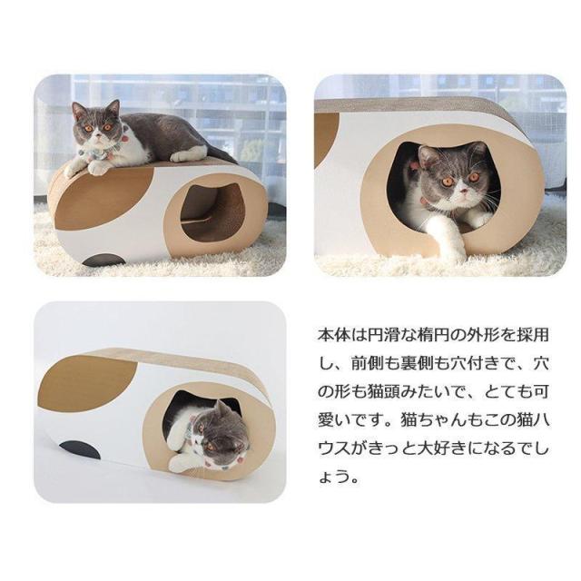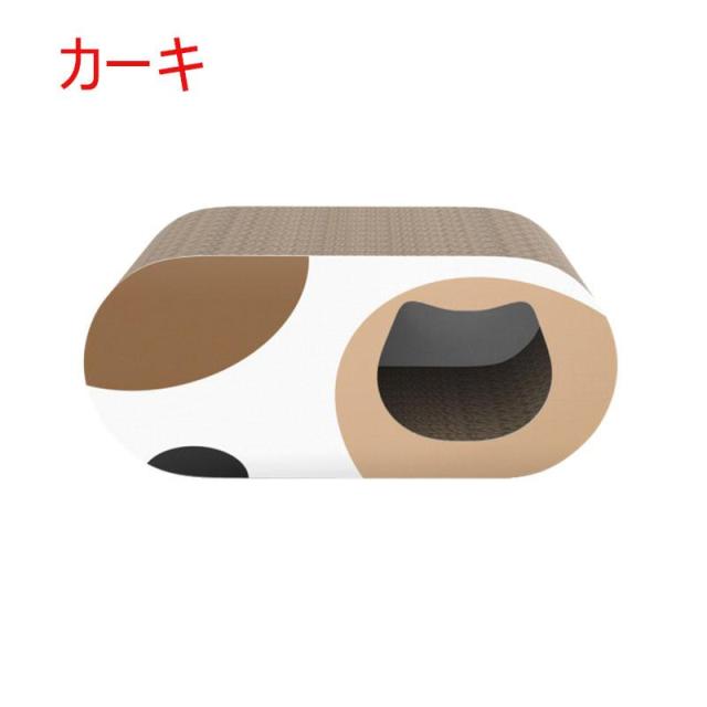 【一台3役】猫つめとぎのサイズ:正面と側面に穴のディザインがあります。猫はそこに隠れたり、遊んだり楽しめます。上面には少し凹んでいる、猫の体型にフィットしやすい、猫は上にゆっくりすることが好き??爪とぎ・猫トンネル・猫ベッドとして使えます。一台3役です。