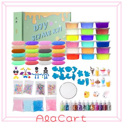 【盛り沢山の豪華スライムキット】女の子と男の子向け超豪華なエプロン付きスライムキットが登場!12色ガラス瓶スパンコール 、18色スライム、24個の軟質粘土、2パックの金魚鉢飾りビーズ 、、2パックの発泡スチロールビーズ、4色装飾品(ランダムな形状)、12個モールドを使って (ランダムな形状)、9個小さいプラスチックワイングラス 、1個网格、面白パーツセット(36ウィジェットが含まれています)、3つのかわいい動物用樹脂パーツ。