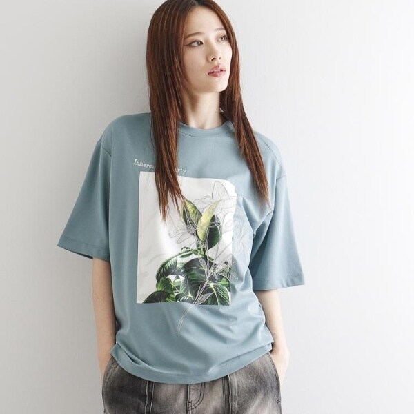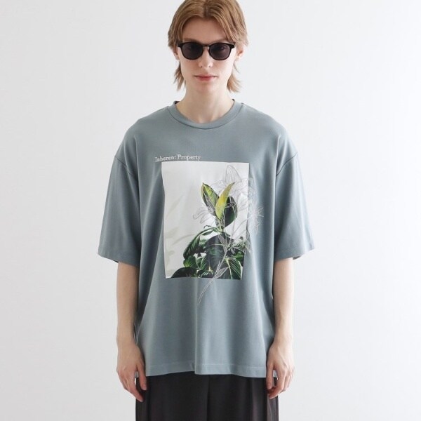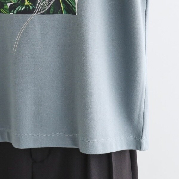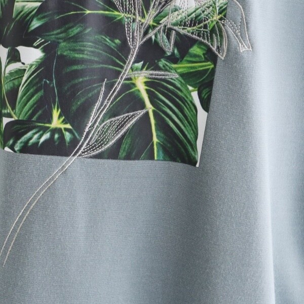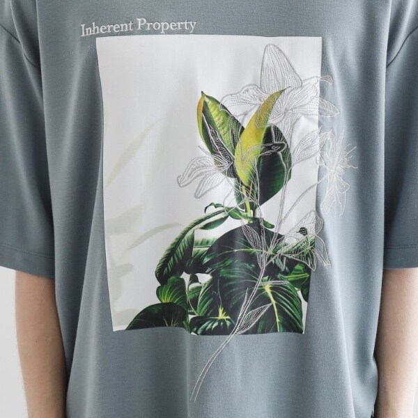 リーフ柄をプリントと刺繍で表現したオーバーサイズTシャツ。