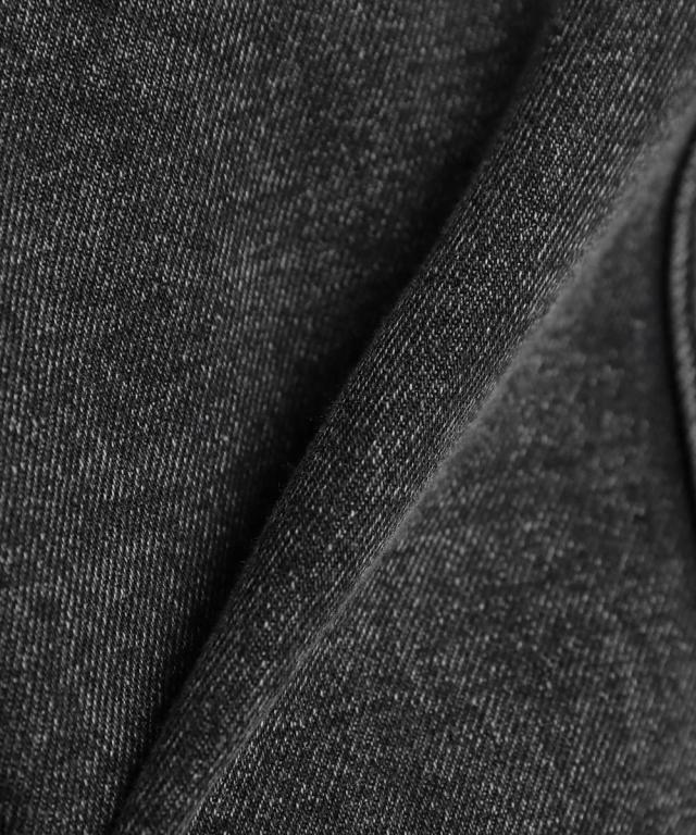 綿100%のデニム生地を使用しています。生地には程よい厚みとハリがあり、着用時に立体的なシルエットをキープします。
