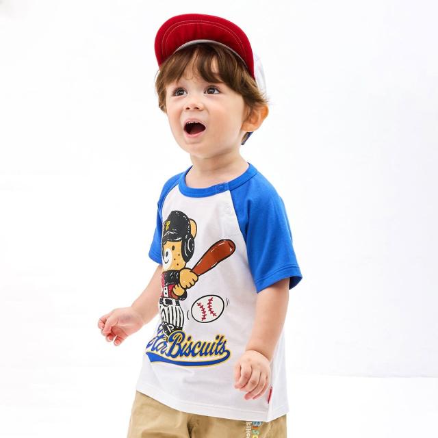 ミキハウス ホットビスケッツのベースボールデザインの半袖Tシャツ。