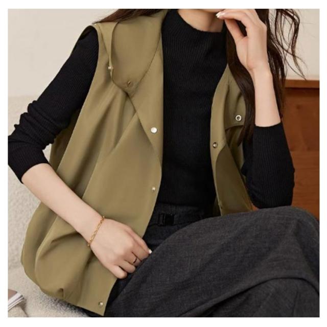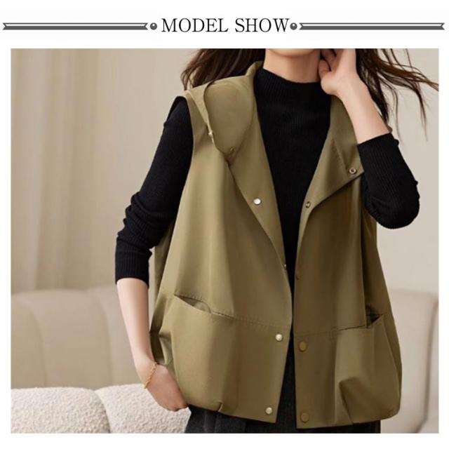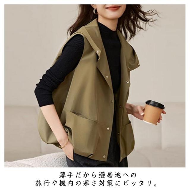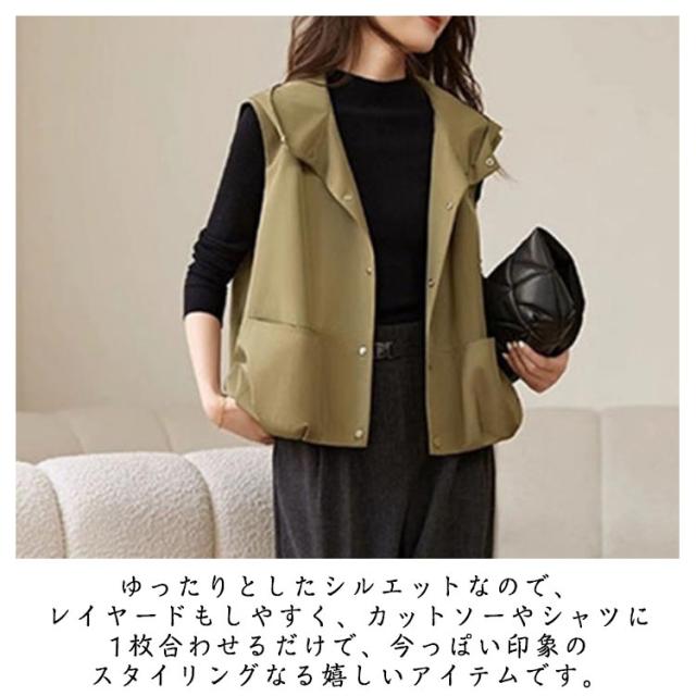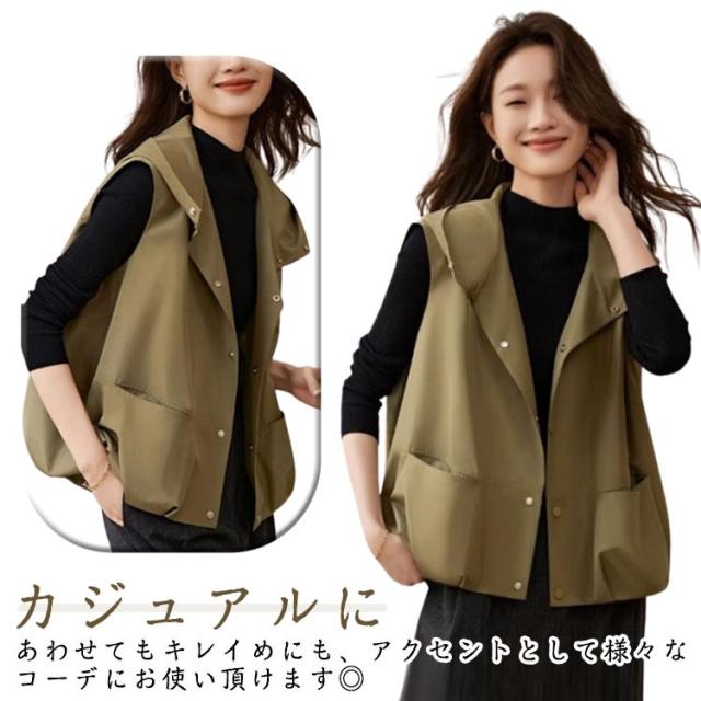 春夏 ベスト アウター レディース ジレ 前開きベスト フード付き 無地 ノースリーブ トップス 羽織り コート 体型カバー レイヤード 春夏 シンプル カジュアル ゆったり 大人