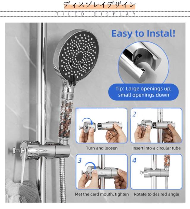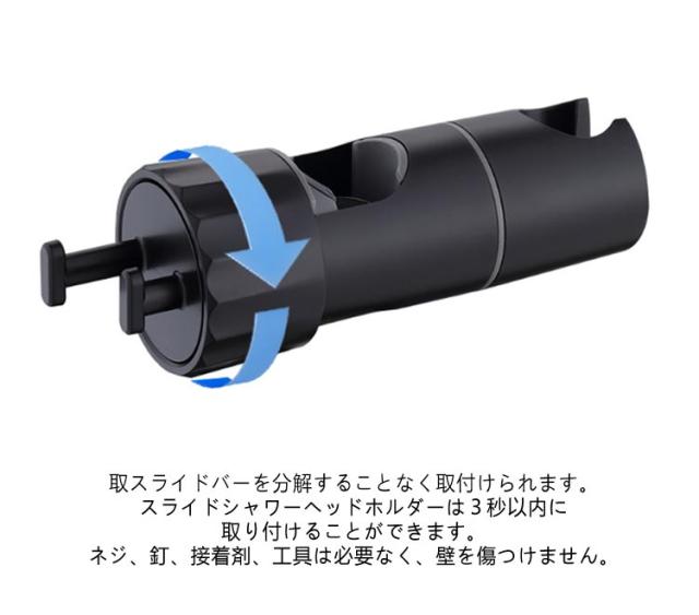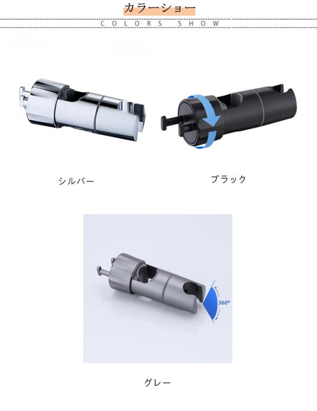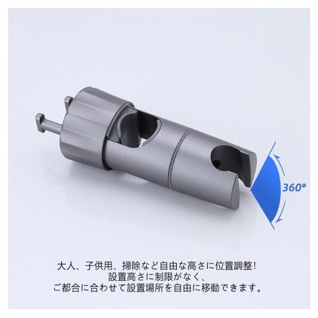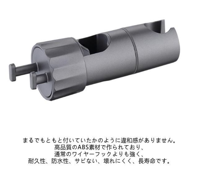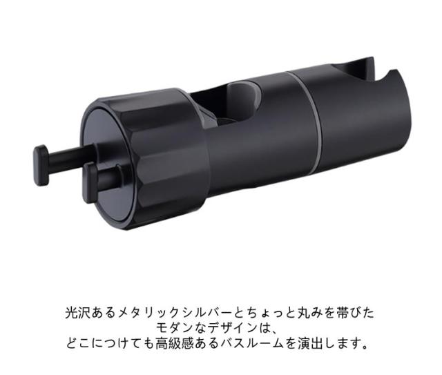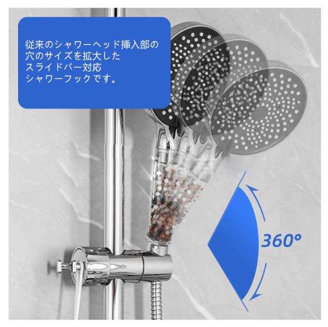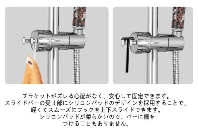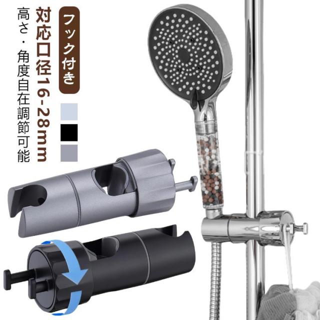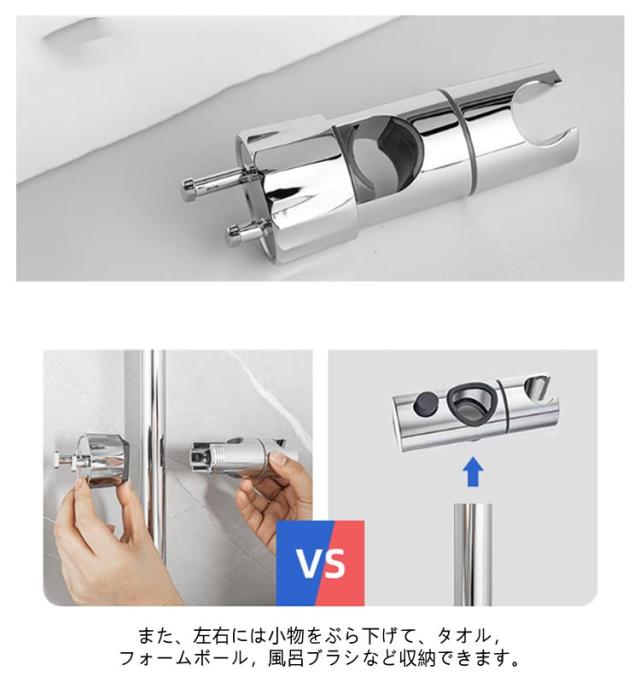 | シャワーヘッドの固定&小物ぶら下げ! 対応口径16-28mm 高さ・角度自在調節可能 フック付き シャワーヘッドホルダー 従来のシャワーヘッド挿入部の穴のサイズを拡大したスライドバー対応 シャワーフックです。 また、左右には小物をぶら下げて、タオル,フォームボール,風呂ブラシなど収納できます。 16mm〜28mmのスライドバーに適用し高さ・角度自在調節可能です。 ほとんどの既存のスライドバーを適応するための調整可能な取付方法を採用。 ブラケットがズレる心配がなく、安心して固定できます。 スライドバーの受け部にシリコンパッドのデザインを採用することで、軽くてスムーズにフックを上下スライドできます。シリコンパッドが柔らかいので、バーに傷を つけることもありません。 シャワーヘッドホルダー部分は360℃回転可能、角度も自由に調節可能です。 取スライドバーを分解することなく取付けられます。スライドシャワーヘッドホルダーは3秒以内に取り付けることができます。 ネジ、釘、接着剤、工具は必要なく、壁を傷つけません。 取外しや向きを変えるのも簡単で掃除等で綺麗にしたい時も便利です。 女性、お年寄り、不器用な方でも簡単に取り付けることができます。 光沢あるメタリックシルバーとちょっと丸みを帯びたモダンなデザインは、どこにつけても高級感あるバスルームを演出します。 まるでもともと付いていたかのように違和感がありません。 高品質のABS素材で作られており、通常のワイヤーフックよりも強く、耐久性、防水性、サビない、壊れにくく、長寿命です。 大人、子供用、掃除など自由な高さに位置調整!設置高さに制限がなく、ご都合に合わせて設置場所を自由に移動できます。 | |