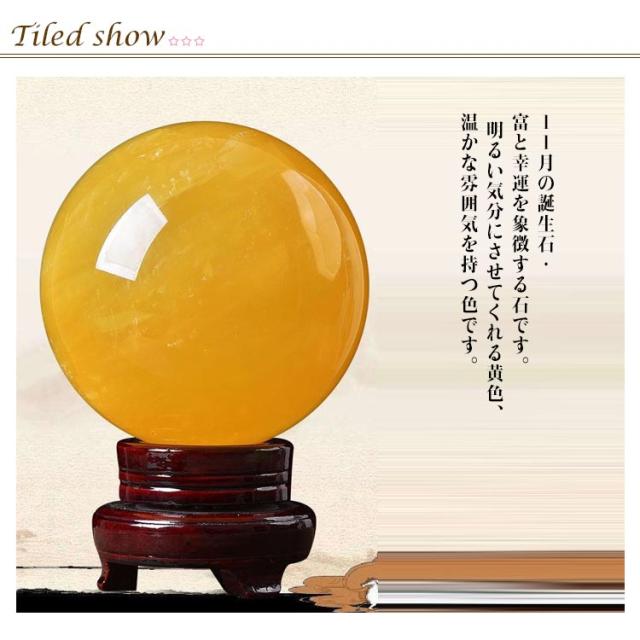 | 黄水晶:富と幸運の象徴。事業運・金運・貯蓄を高める。 11月の誕生石・富と幸運を象徴する石です。 明るい気分にさせてくれる黄色、温かな雰囲気を持つ色です。 シトリンは古くから『幸運の石』として大切にされます。 明るく黄色に透き通ったシトリンの外観はとても美しく、宝石やアクセサリーとして人気の高い石です。 水晶玉は縁起のいい財運を招きます、商売をする家や店の入り口に置いてもいいです。 このクリスタルボールは天然水晶から溶かし、化学や染色などの処理は一切がありません。 手作業で採掘、彫刻、精製されますので、内部パターンはそれぞれ異なっております。 | |