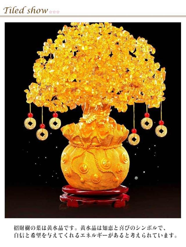 | 「金の生る木」、財運を呼び込む風水置物です。 大きいサイズ 招財樹の葉は黄水晶です。黄水晶は知恵と喜びのシンボルで、自信と希望を与えてくれるエネルギーがあると考えられています。黄水晶は富の石の美称で、商売繁盛,事業の発展を安定させ、金運をもたらすと言われています。招財樹はサービス系のビジネス会社や事業者に欠かせない財宝です。 新年祝い・新築祝い・開店祝い・開業祝いなどの贈り物にも活用されています。招財樹の枝は銅線ですので、お好みに合わせて自由に形をを変えられます。 招財樹は縁起のいい財運を招きます、商売をする家や店の入り口に置いてもいいです。会社の社長室、応接室、受付などにも最適です。玄関、リビング、寝室などに置き、厄除けや浄化用としてお使いいただけます。 | |