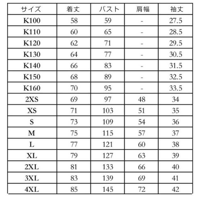 | サイズ | XS S M L XL 2XL 3XL 4XL K100 K110 K120 K130 K140 K150 K160 |