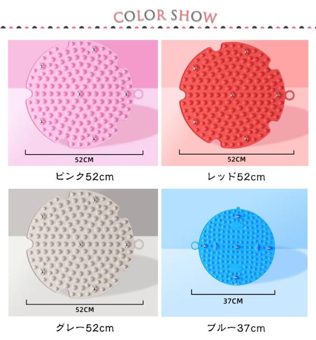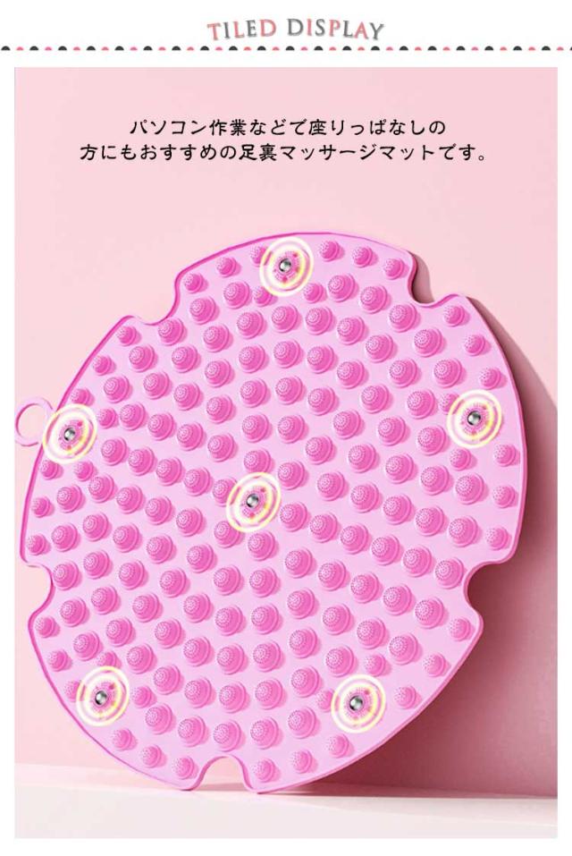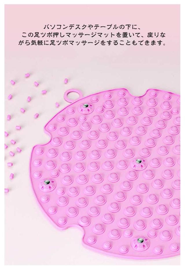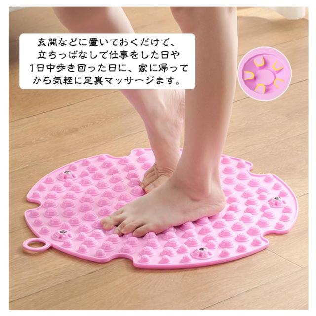 | 健康は足の裏から! 日々の疲れを癒す足ツボマットです。 踏むだけで足の裏の反射区を刺激することで、新陳代謝と血液循環を促進します。 柔らかいTPE製のマットなので、ツボ押し部分が変形してしまう心配もございません。 玄関などに置いておくだけで、立ちっぱなしで仕事をした日や1日中歩き回った日に、家に帰ってから気軽に足裏マッサージます。 パソコンデスクやテーブルの下に、この足ツボ押しマッサージマットを置いて、座りながら気軽に足ツボマッサージをすることもできます。 パソコン作業などで座りっぱなしの方にもおすすめの足裏マッサージマットです。 汚れが付着しにくいマットで、もし汚れが付いてしまっても、簡単に水洗いで落とすことができます。 | |