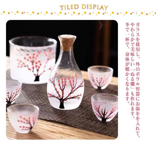 | 【ガラス&おしゃれな桜柄】 徳利1個+お猪口*2個+冷酒器/温め器*1個のおちょこセットです。 ガラスを採用し、外のボウル容器にお湯をを入れて、やわらかで美味しい「ぬる燗」も作れます。冬で一杯で、身体が暖かくなります。 ボウル容器に氷水を入れれば、冷酒も簡単に作れます。 適量のお酒が楽しめるので、ちびちびと一人で呑むのに最適なサイズ。 | |