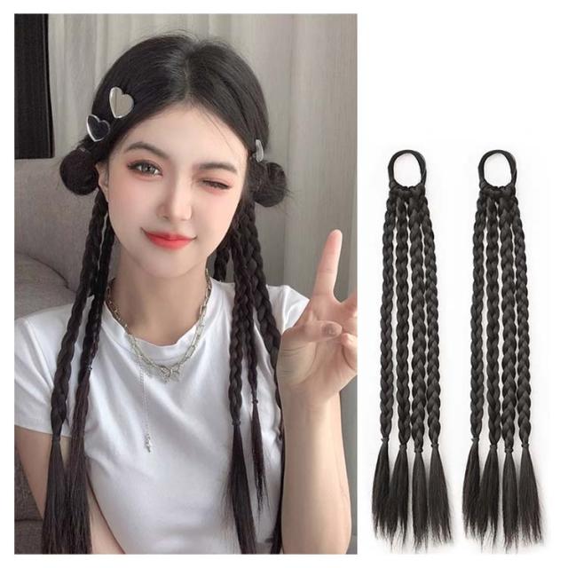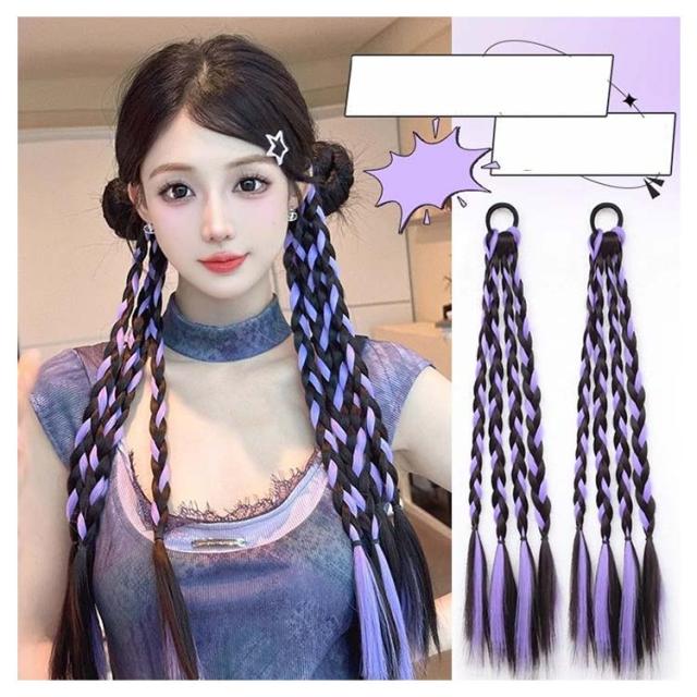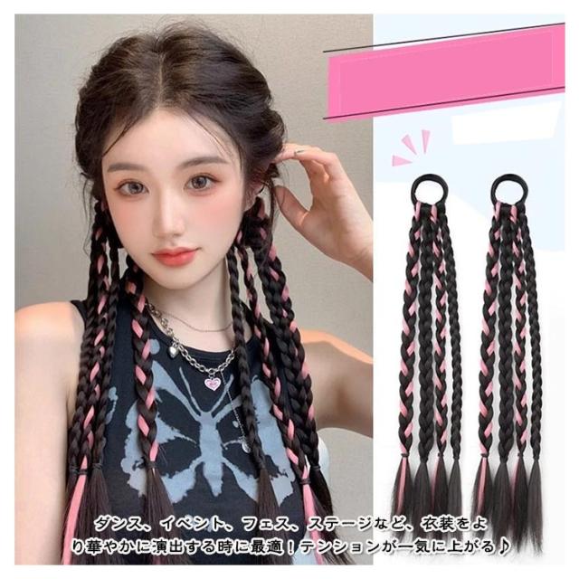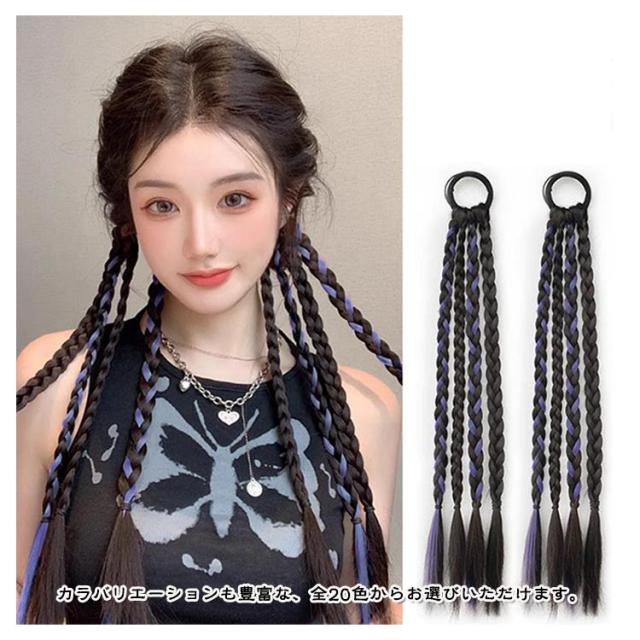 編み込み エクステ 2本セット カラーエクステ ゴムタイプ 簡単 便利 ヘアーエクステ ツインテール レデイース 女の子 子供 キッズ ガールズ ウイッグ ドレッド ピンク ブルー レッド パープル 長さ45cm つけ毛 派手 メッシュ グラデーション ヒップホップ 送料無料