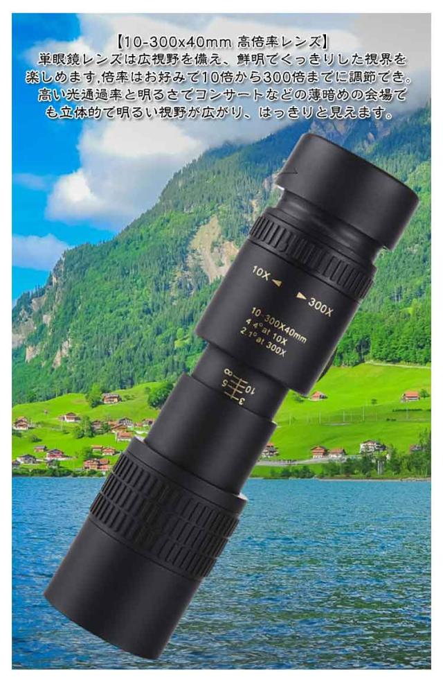| 【単眼鏡・望遠レンズ】【3点セット】 セット内容: 本体、スマホホルダー、三脚 【10-300x40mm 高倍率レンズ】 単眼鏡レンズは広視野を備え、鮮明でくっきりした視界を楽しめます,倍率はお好みで10倍から300倍までに調節でき。高い光通過率と明るさでコンサートなどの薄暗めの会場でも立体的で明るい視野が広がり、はっきりと見えます。 【BAK4単眼鏡 】 完全にマルチコーティングされたレンズコーティングと内部BAK4プリズム。 光の反射と最小限の歪み、マルチコーティングされた光学系により、優れた光透過率と明るさが保証されます。 プリズムシステムには、高品質の画像を提供する完全に丸い射出瞳があります。 【スマホの望遠機能も強化】 滑り止めのスマホアダプターはほとんどのスマホに対応し、スマホを望遠鏡の接眼レンズに正確かつしっかりと固定できます。標準の三脚は手ぶれ防止機能があり、撮影に最適な角度まで簡単に調整でき、ハンズフリーで撮影の品質を向上させます。 【防水性・防曇性】 フィールドスコープ本体および接眼レンズ本体内部に窒素ガスを充填することによって、雨や水しぶきで本体や接眼レンズが濡れても、光学系の内部に曇りやカビが生じにくい防水構造になっています。望遠鏡本体と接眼レンズの接続部分は防滴仕様です。 【様々なシーンで大活躍】ライブ、コンサート、スポーツ観戦、アウトドア、登山、運動会など様々なシーンでお使いいただけます。 | |