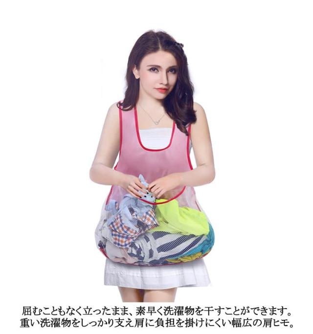 | 洗濯カゴを使わなくても洗濯機から直接、おなかのポケットに入れて、洗濯竿まで持っていけます♪ 屈むこともなく立ったまま、素早く洗濯物を干すことができます。 重い洗濯物をしっかり支え肩に負担を掛けにくい幅広の肩ヒモ。 コンパクトに畳めるので収納場所にも困りません! | |