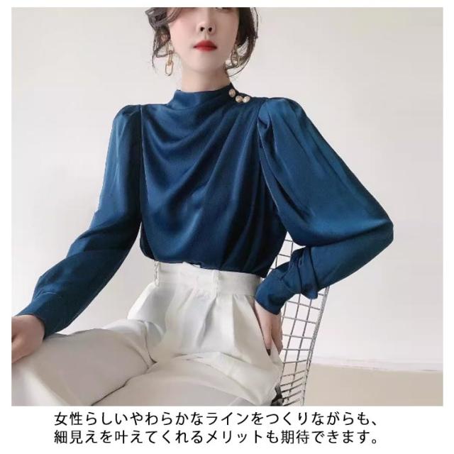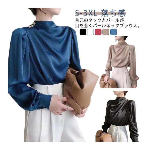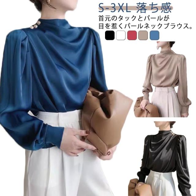 ブラウス パール付き ブラウス パール付き レディース ギャザー 上品 フォーマル パール シャツ トップス 長袖 ギャザー 袖コンシャス ボリューム とろみ 落ち感 ネック フェミニン 華やか フォーマルブラウス