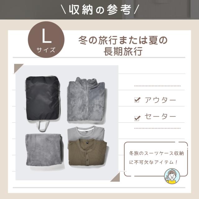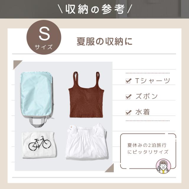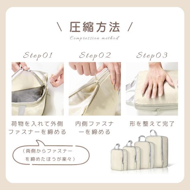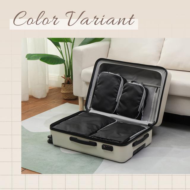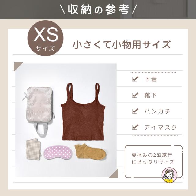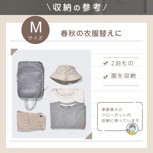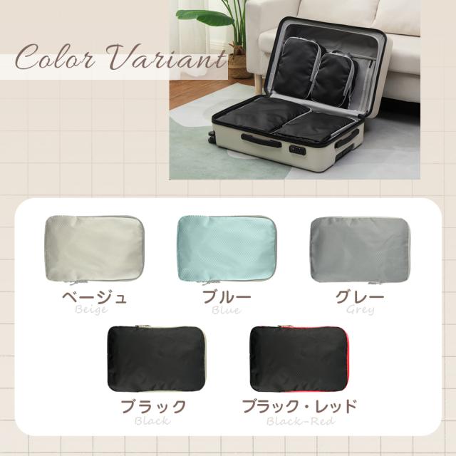 大小4種類のサイズが揃い、用途に応じて使い分け可能!大きなサイズはジャケットやセーターなどの厚手の衣類に最適、中サイズはシャツやパンツ、小サイズは下着や靴下、最小サイズはアクセサリーや小物類の収納に便利。スーツケース内のスペースを有効活用し、旅行や出張時の荷物整理がスムーズに!