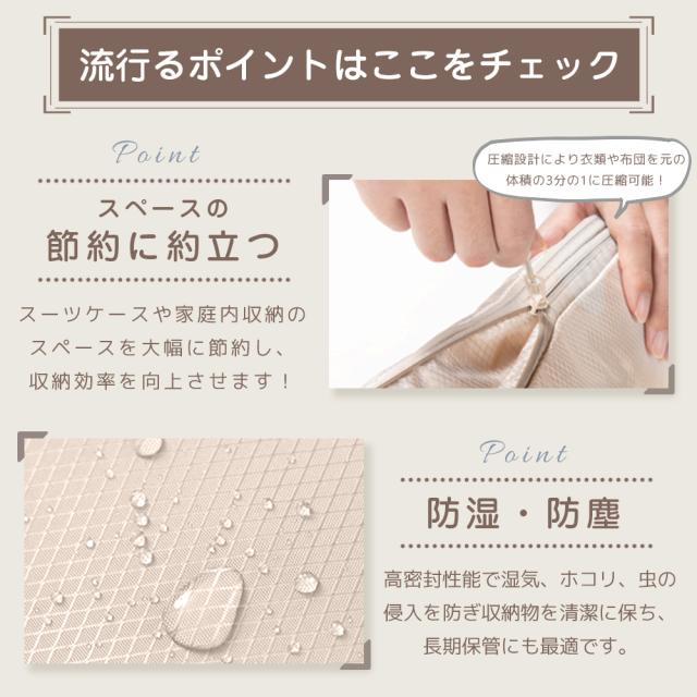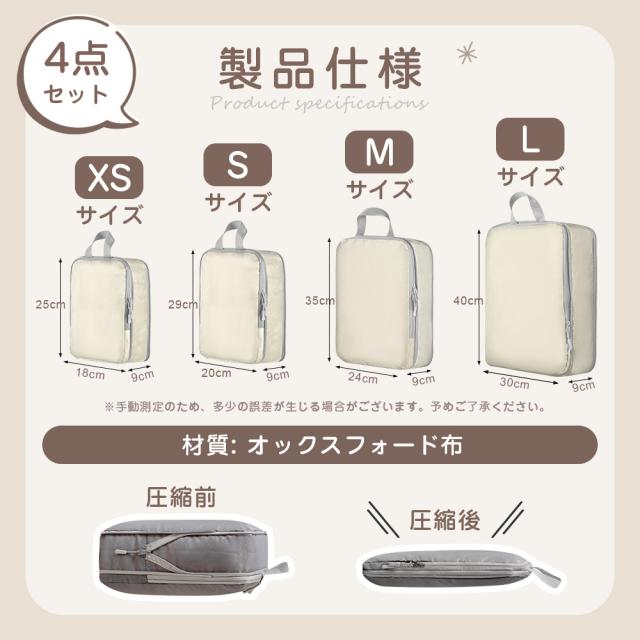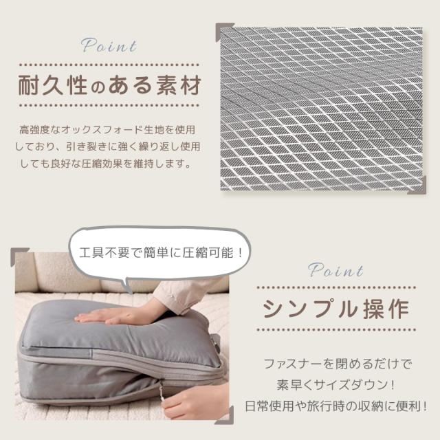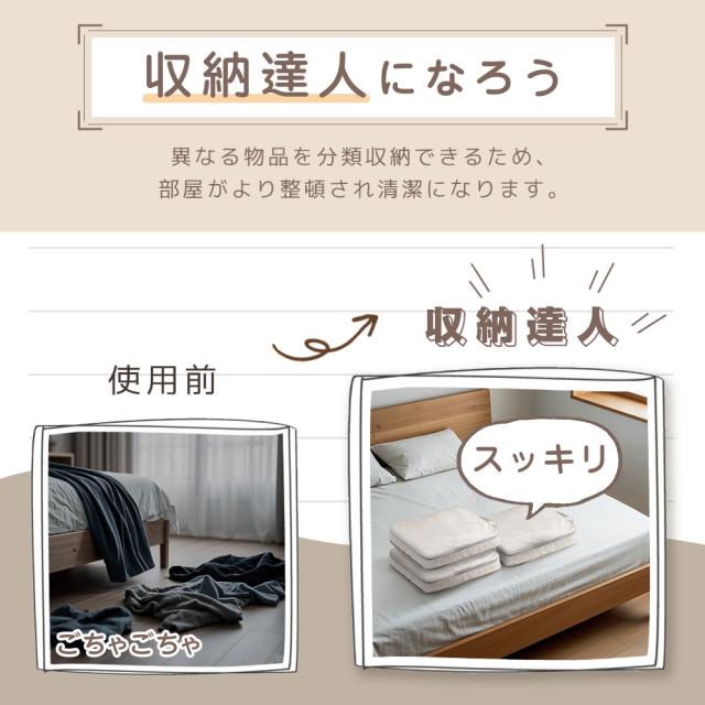 圧縮機能で収納力アップし、荷物をコンパクトに整理可能。防水・防臭・防虫仕様で衣類をしっかり保護。軽量&耐久性に優れ、繰り返し使用可能。さらに、大小4種類のサイズで衣類や小物を用途別に分けられ、旅行・出張・収納に大活躍!