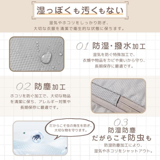 特殊な防水素材で湿気や水滴をブロックし、大切な衣類を守ります。防臭機能により、長時間の旅行でもニオイを抑え、清潔をキープ。さらに、防虫効果で衣類を害虫から保護し、安心して収納可能。快適な旅をサポートする必須アイテム!