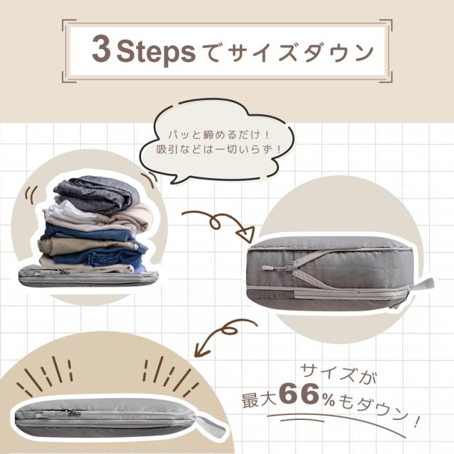 圧縮用の吸引機などは不要で、ファスナーを閉めるだけで簡単に衣類を圧縮できるトラベルポーチです。2つの圧縮ジッパーを採用して、衣類スペースをより多く節約でき、約66%節約することができます!かさばる衣類や荷物を圧縮して、スーツケース内がすっきり整理整頓されます。