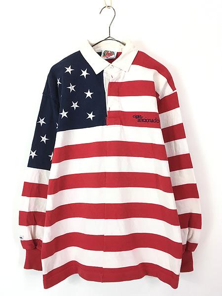 古着 90s Canada製 BARBARIAN 星条旗 フラッグ パターン ラガー ラグビー シャツ L 古着