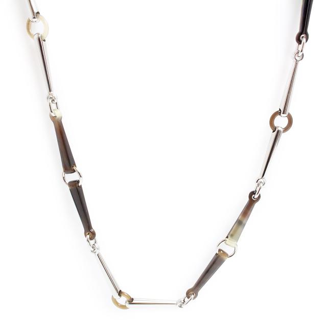 【コメント】 エルメスのメタルネックレス『Mors』。ホーンとラッカー仕上げ、パラジウム仕上げのメタルネックレスです。大人でシックなアクセサリーが好きな方にお勧めしたいアイテム。バッファローホーンの部分は一点ごとにトーンが異なるナチュラルカラーです。