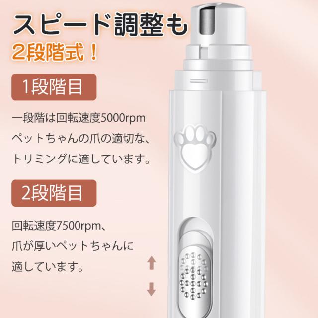 【2段階スピード】1段階スピードは5000rpm、2段階スピードは7500rpm ペットの爪の厚み?硬さによりスピードの選択ができます。