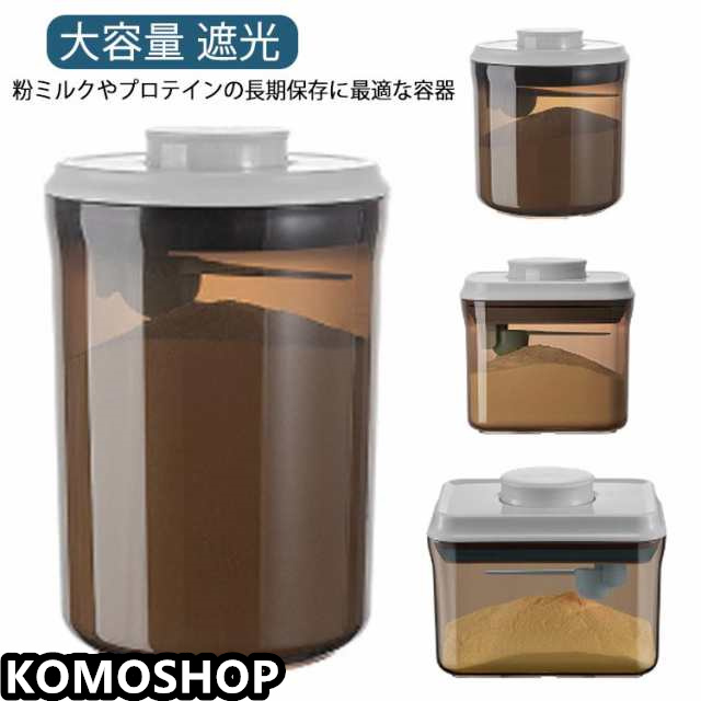 | 茶色遮光デザイン!粉ミルクやプロテインの長期保存に最適な容器 フタについているボタンを押すだけで密閉可能!片手でワンタッチなので、料理中の手がふさがっている状況でも使いやすいのがうれしいポイント。 フタ部分はスプーン収納所があり、サイズ違いスプーンにも対応できます。 コンパクトなサイズ、外遊びや旅行に大変便利なアイテムです。 粉ミルクだけでなく、米やナッツなどの保存容器としてもおすすめ。 | |