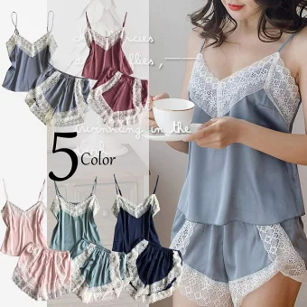 デコルテが美しく見える レース×サテン調 ルームウェア キャミソール ペチパン 上下セット パジャマ 部屋着 全5色