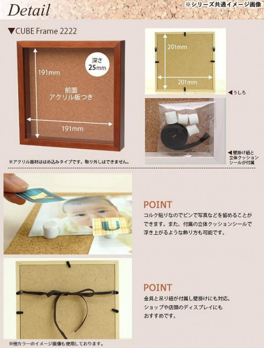 商品詳細:正方形のおしゃれなフォトフレーム。木目を活かしつつ、薄塗りになっているため、少し地肌が見えます。奥行が25ミリあり、背面がコルクになっているので、ピンなどを使ったフラワーアレンジやウェルカムボードとしてもオススメ♪(※コルクシートは裏板に付着していて、はがすことはできません。) 生産国:中国 素材・材質:木、コルクシート、樹脂 商品サイズ:外寸:217×217×38mm、内寸:201×201×25mm、窓寸:191×191mm 重量:410g 仕様:壁掛・スタンド両用立体クッションシール付き壁掛用金具・吊り紐付き