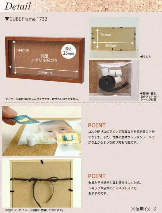 商品詳細:長方形のおしゃれなフォトフレーム。木目を活かしつつ、薄塗りになっているため、少し地肌が見えます。奥行が25ミリあり、背面がコルクになっているので、ピンなどを使ったフラワーアレンジやウェルカムボードとしてもオススメ♪(※コルクシートは裏板に付着していて、はがすことはできません。) 生産国:中国 素材・材質:木、コルクシート、樹脂 商品サイズ:外寸:170×320×38mm、内寸:154×304×25mm、窓寸:144×294mm 重量:490g 仕様:壁掛・スタンド両用タイプ立体クッションシール付き壁掛用金具・吊り紐付き