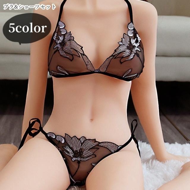 素肌が透けるシースルー生地がセクシーなブラ&ショーツセット。