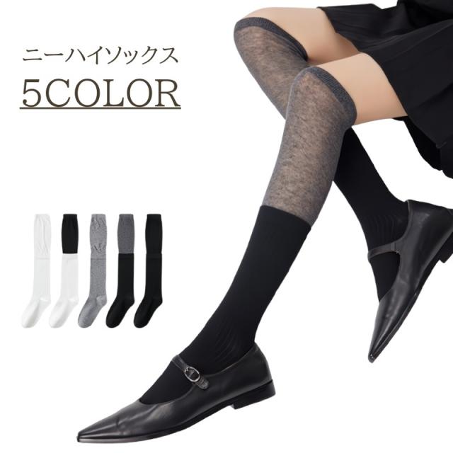 ニーハイソックス レディース ソックス 靴下 ハイソックス 薄手 レイヤード風 シンプル 無地 リブ 通勤 通学 オフィス 学生