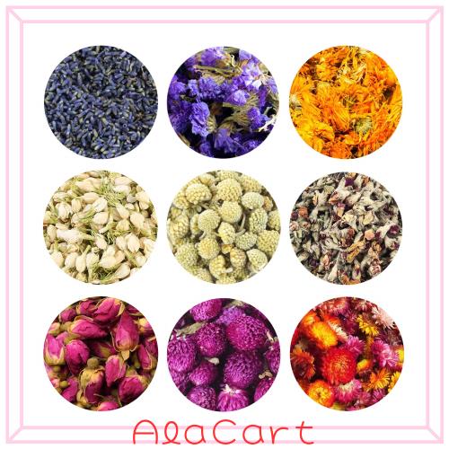 1包あたり9袋花びらとつぼみ:ラベンダー、Forget-me-not、マリーゴールド、ジャスミン、scindapsus aureusの花、リンゴの花、バラのつぼみ、Gomphrena globosa、ヘリクリサム。