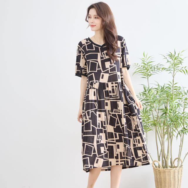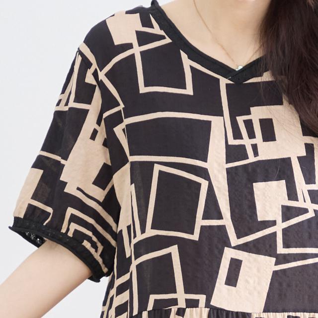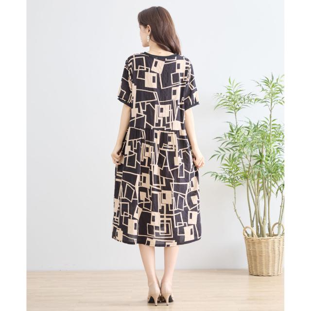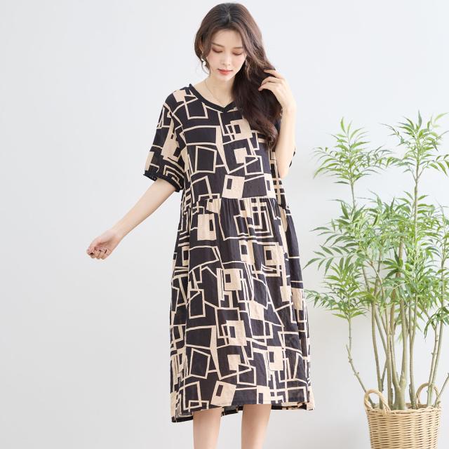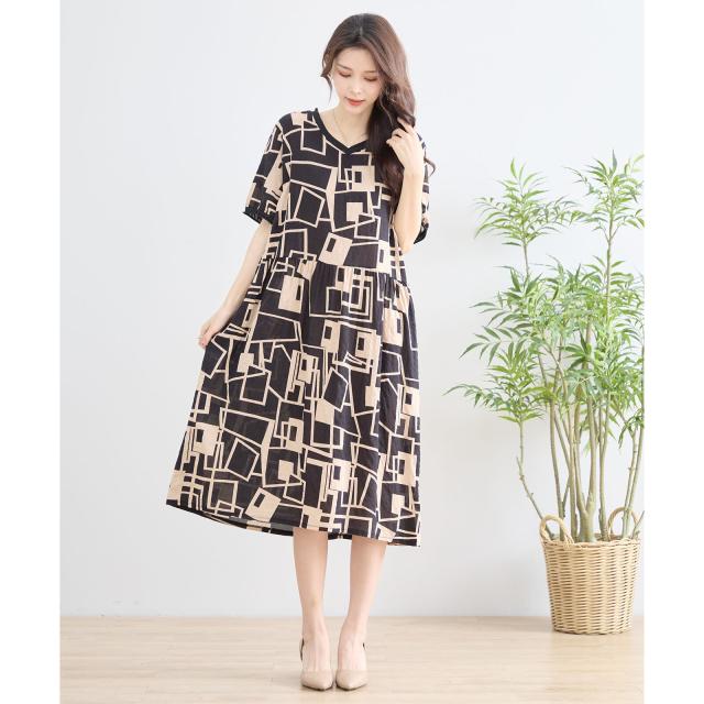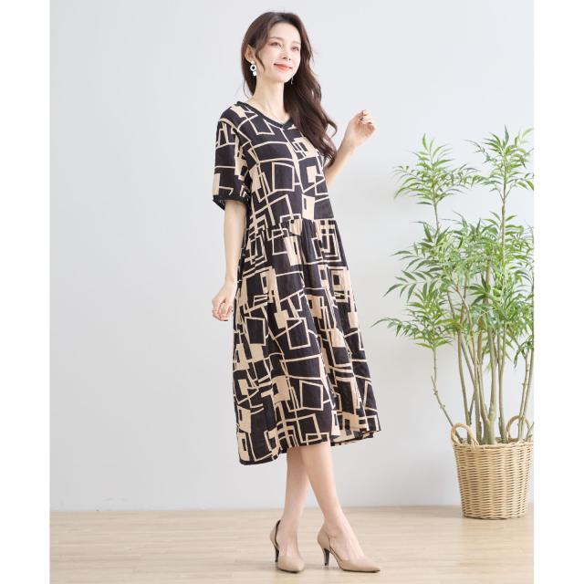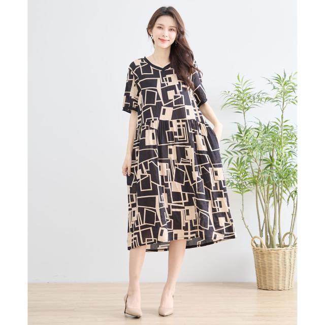 【即納】アート幾何柄Vネックコットンワンピース 半袖 膝下丈 体型カバー シャツワンピ 春夏 新作