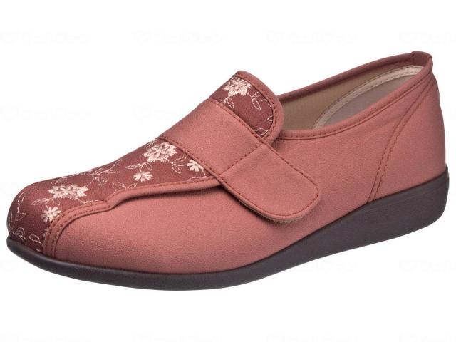 "履き口が面ファスナーのベルトで、脱ぎやすく履きやすいシューズ。柔らかい印象で、女性らしいデザインです。ひざの負担を軽減し、体重移動をスムーズにする「フットオンコントローラーシステム」を採用。 また、靴底に""フレックスライン""を配置することで、なめらかな屈曲を促進し、歩行しやすい設計になっています。【足に優しい4つのポイント】○体重移動をコントロールして、歩行をサポート○水に浮くほど軽い靴底に、超軽量のエクスパンセル配合ラバーを使い、足の負担を軽減しました。○つまずきにくく安心つま先を20mm、踵を12mm巻き上げつまずきを防止。着地や蹴り出しがスムーズに行えます。○安心・安全の国内生産すべての「快歩主義」は日本製です。自社久留米工場で、入念な品質管理を行っています。■撥水加工つき。■水に浸けて丸洗いができるので、靴や足を清潔に 保て、長くご愛用いただけます。■足の負担を軽減する、軽量設計です。"アッパー素材:合成繊維ソール素材:ゴム底○サイズ:23.0cm○足囲:3E○原産国:日本○ヒール外寸:約25mm甲の刺繍がおしゃれ