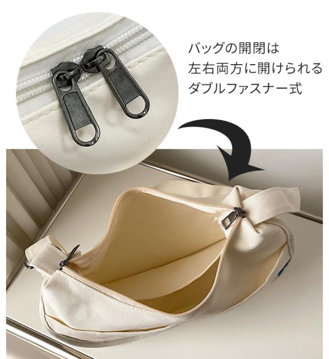 | カジュアルなキャンバス素材のハーフムーンショルダーバッグです。 開閉しやすいダブルファスナーデザイン。 フロントには大きめポケットも付いてスマホなど小物も取り出しやすい♪ ショルダーストラップの長さは調整可能です。 |
