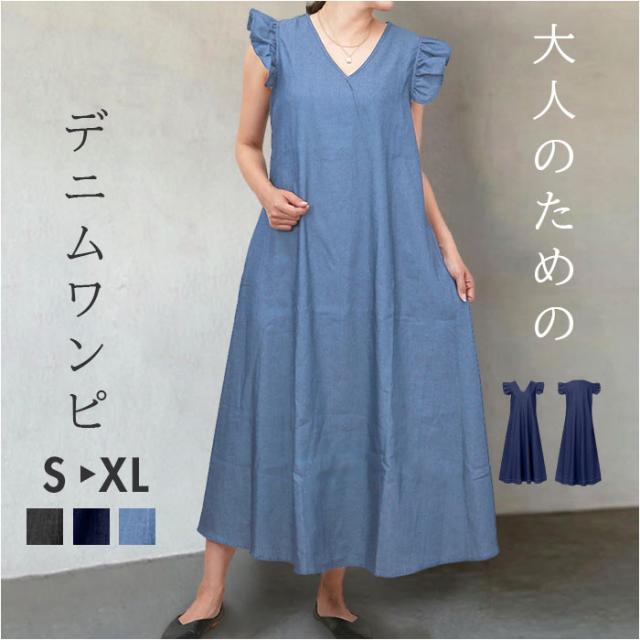 デニムワンピース レディース 通販 ワンピース ロングワンピース ロングワンピ デニムワンピ ワンピ デニム ロング丈 ロング フレア袖 Aライン 無地 シンプル Vネック ゆったり