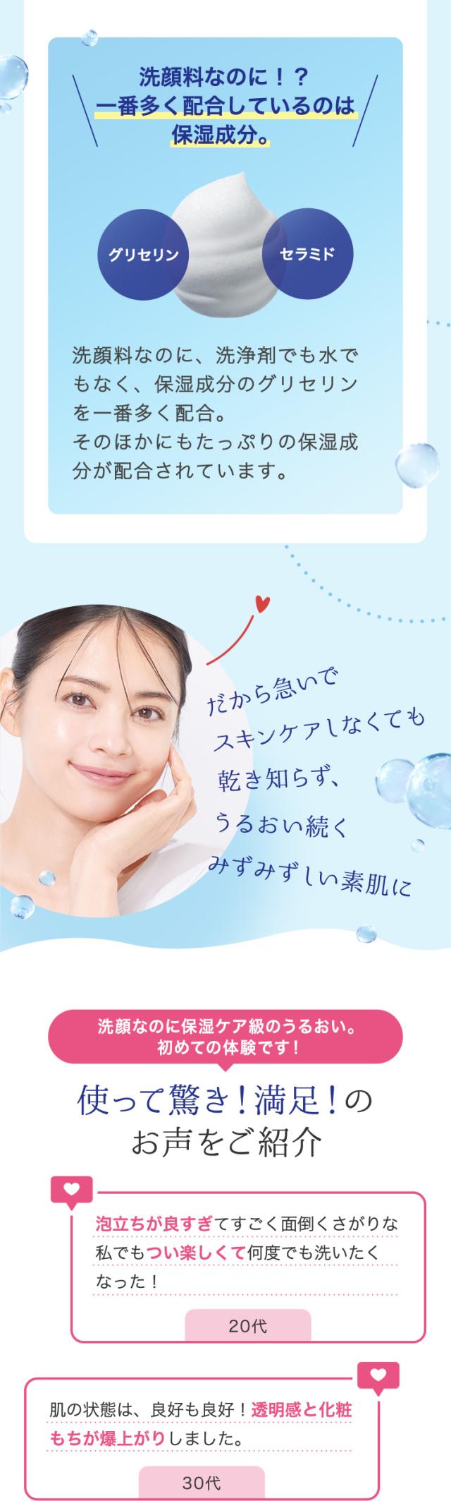 もこもこの泡で、肌のうるおいを守り、みずみずしく透明感のある肌に整えます。