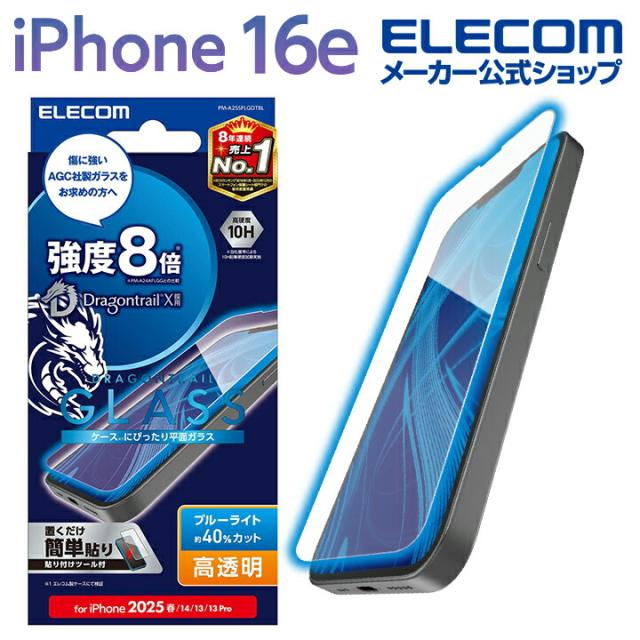 エレコム iPhone 16e 用 ガラスフィルム ドラゴントレイル 高透明 ブルーライトカット iPhone16e iPhone14/13/13pro ガラス 液晶 保護フィルム ┃PM-A25SFLGDTBL